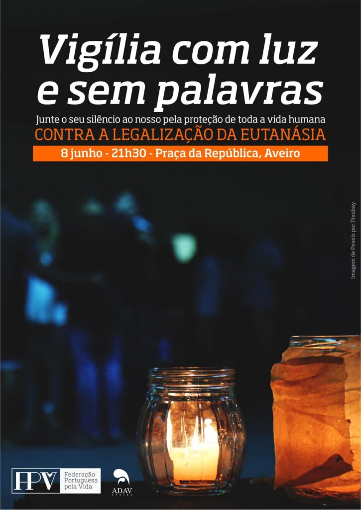 A ADAV e a Federação Portuguesa pela Vida promovem no próximo dia 8 de junho uma Vigília “com luz e sem palavras” na Praça da República, em Aveiro, pelas 21.30h. A ADAV convida a juntar o seu silêncio ao nosso pela proteção de toda a vida humana contra a legalização da eutanásia.