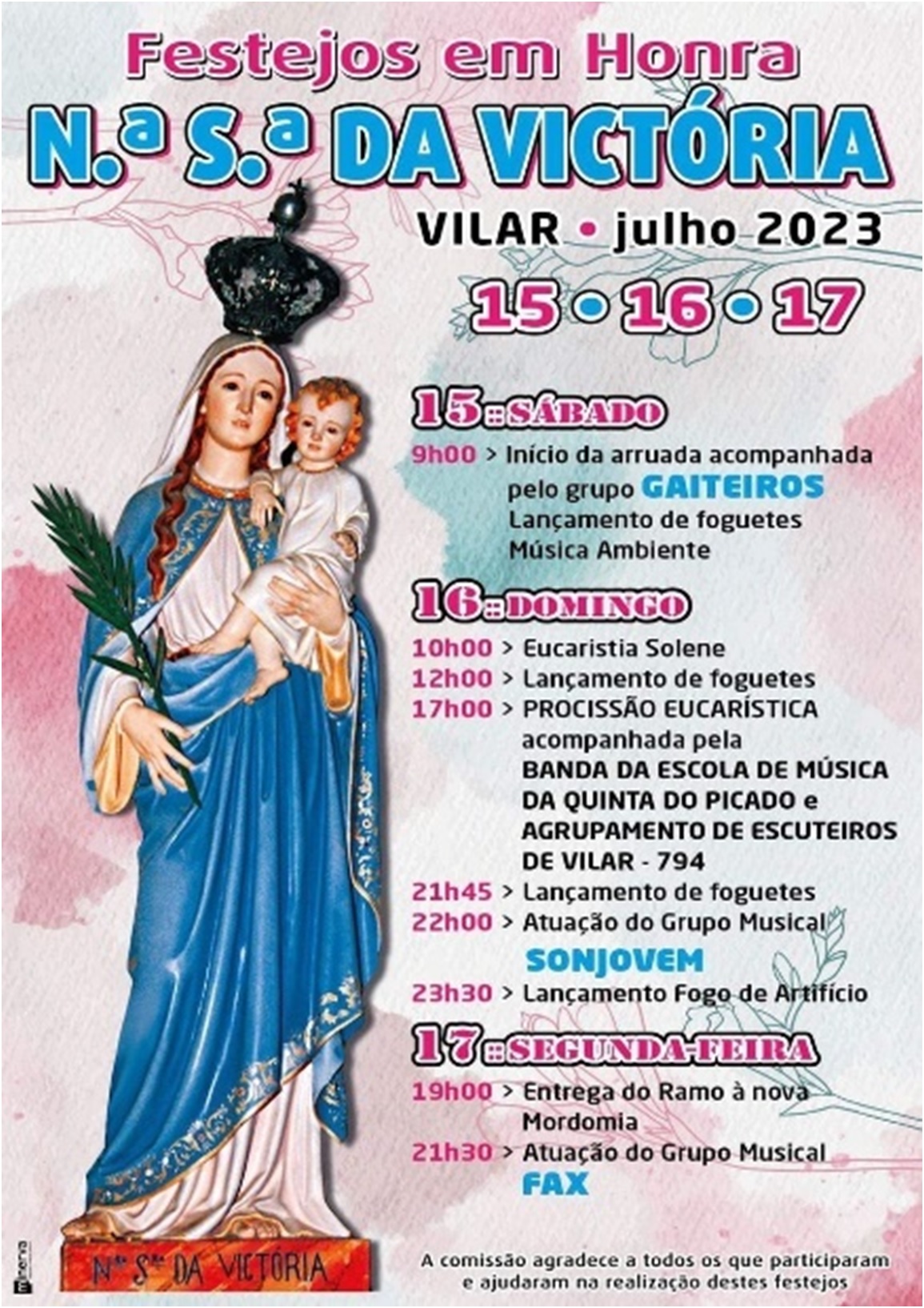 Decorre no próximo fim de semana a festa de Vilar. Uma festa tradicional, a que a Comissão de Festas já nos habituou com os principais momentos: Missa no Domingo, pelas 10h e a procissão eucarística às 17h. Na segunda-feira a festa termina com a entrega do ramo e a atuação do grupo musical FAX.