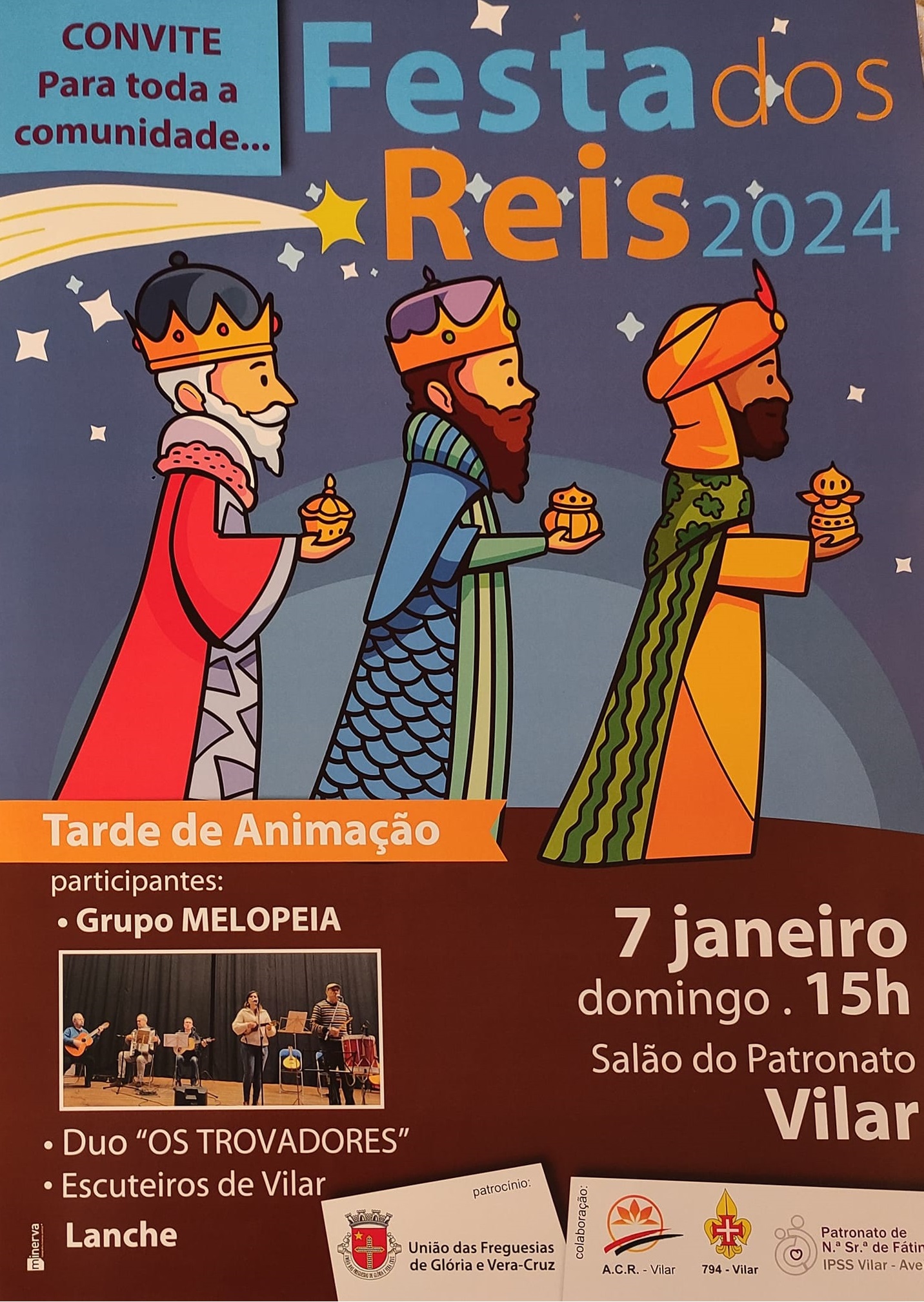 É na próxima tarde do dia 7 de Janeiro (domingo) pela 15h, no Salão do Patronato de Vilar. Será uma Tarde de de Animação com o Grupo “Melopeia”, o Duo “Os Trovadores”, os Escuteiros de Vilar. No fim haverá um Lanche.