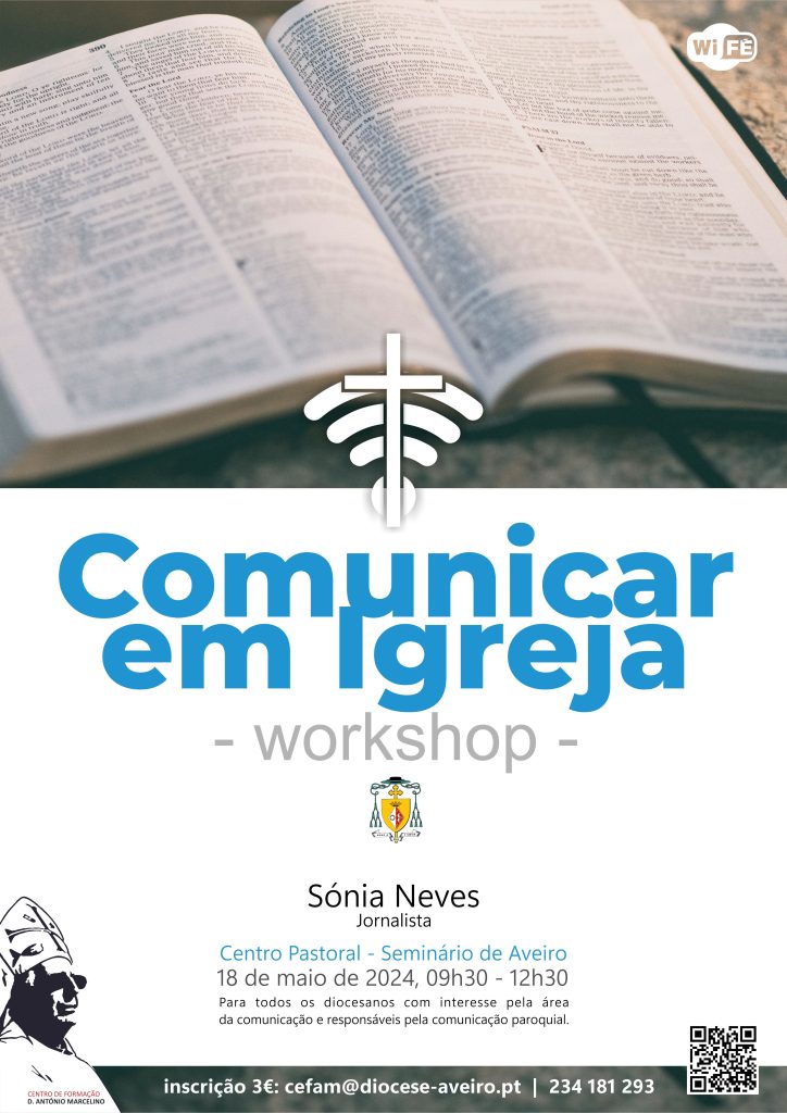 O CEFAM com o apoio do Secretariado Diocesano das Comunicações Sociais vai promover o workshop “Comunicar em Igreja”, no próximo dia 18 de maio, das 09h30 às 12h30, no Centro Pastoral [Seminário de Aveiro].