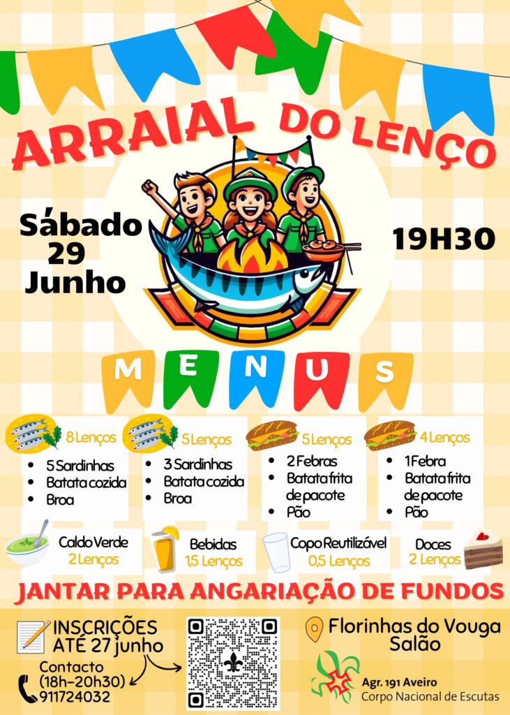 Dia 29 de Junho, a partir das 19h30 no salão paroquial realiza-se o “Arraial do Lenço” com sardinhada. Inscrições na secretaria ou através do número 911 724 032 (a partir das 18h30).