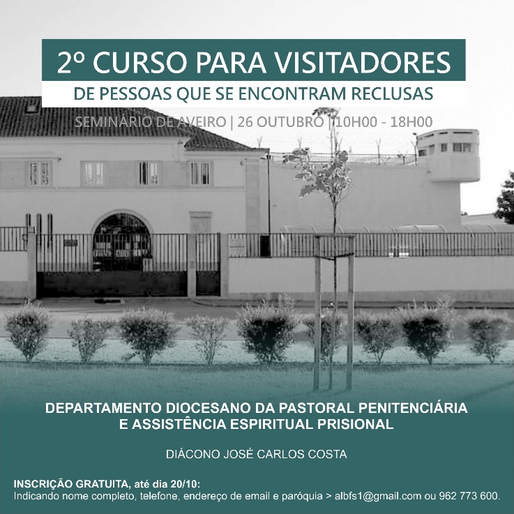 Este curso é organizado pelo Departamento Diocesano de Pastoral Penitenciária e Assistência Espiritual Prisional. As inscrições são gratuitas e devem ser formalizadas até dia 20 de Outubro, para albfs1@gmail.com ou 962 773 600.