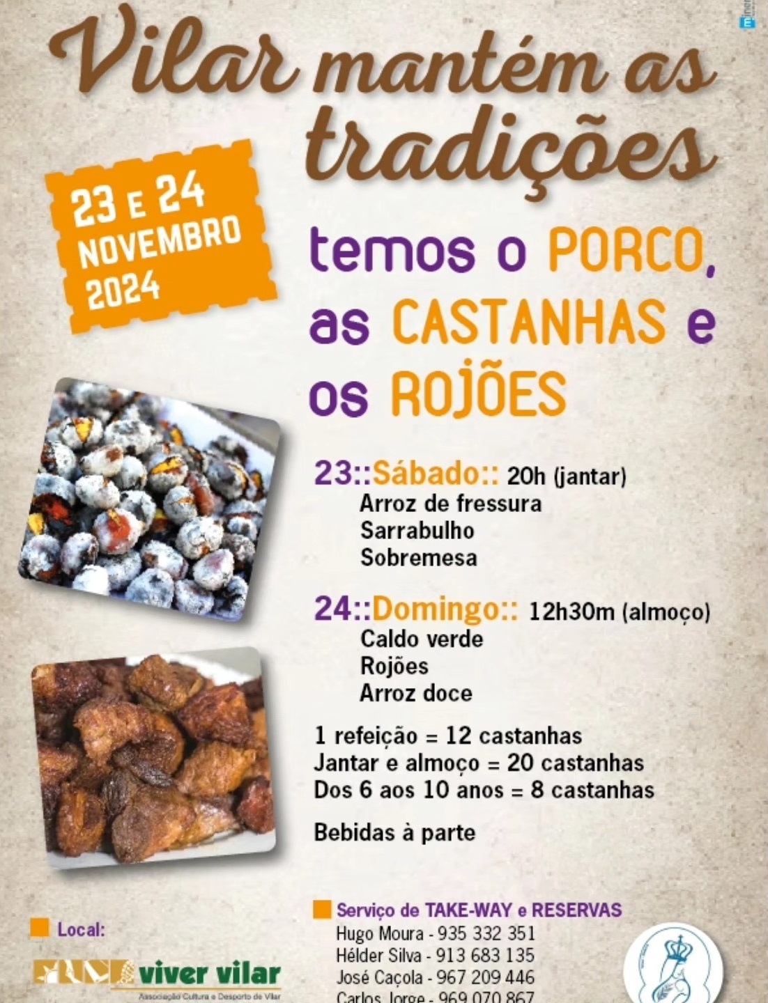 A Comissão de Festas de Nossa Senhora da Victória – Vilar, organiza o tradicional convívio de Novembro com Porco, Castanhas e Rojões. Será já, no próximo sábado dia 23 de Novembro ao jantar (20h) e domingo dia 24 de Novembro ao almoço (12h30) na Associação Cultural “Viver Vilar”. Não deixe de participar!