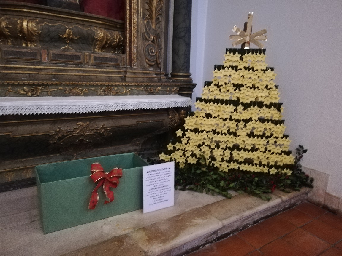 A árvore solidária, montada e exposta na Capela do Sagrado Coração de Jesus, lembra aos que participam nas nossas Celebrações a necessidade de contribuírem para o cabaz de Natal das famílias apoiadas pela Conferência Vicentina da nossa Paróquia.