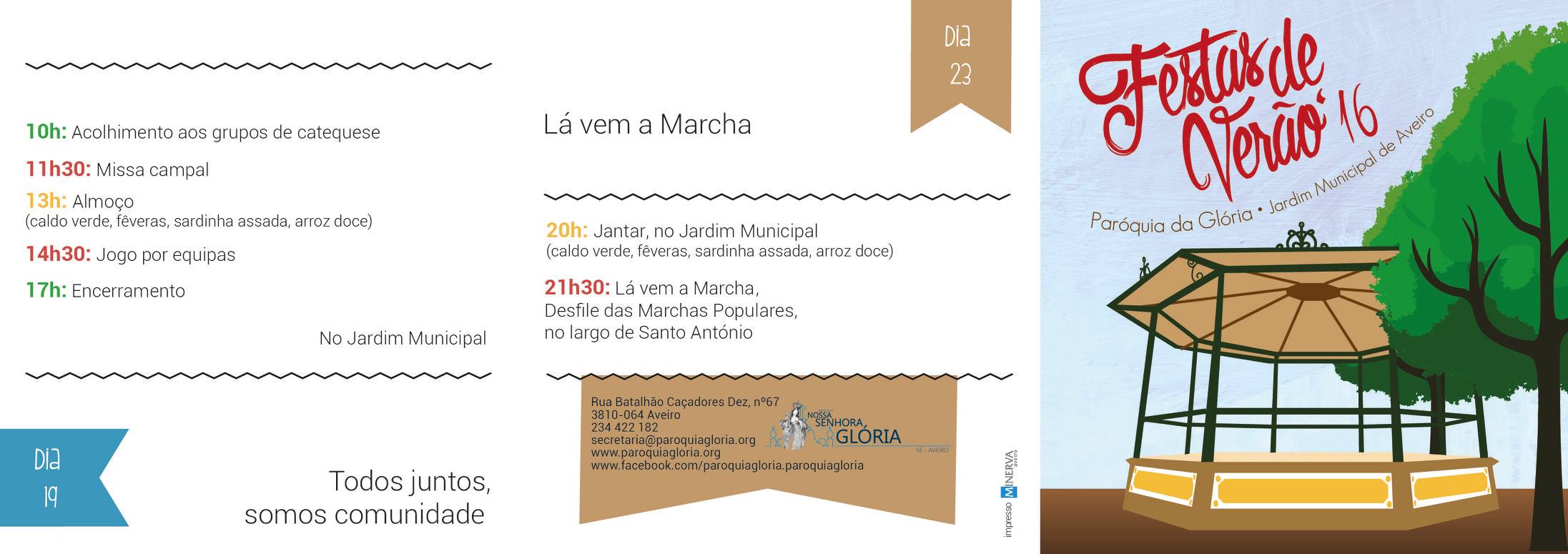 Esta tradicional iniciativa que a nossa Paróquia organiza no mês dos Santos Populares, no Parque Infante D. Pedro, já é uma “marca registada” da animação da cidade, conjugando boa gastronomia, música e muita animação. Com o intuito de contribuir para uma cidade mais festiva e animada, este ano durante as tardes haverá música em diversos espaços do Bairro Histórico de Aveiro, Rua Direita e adjacentes, em parceria com a “CORDA” e com a preciosa colaboração de instituições como o Conservatório de Música de Aveiro de Calouste Gulbenkian, a Sociedade Musical Santa Cecília, entre outras associações ou artistas que se apresentam a solo.
