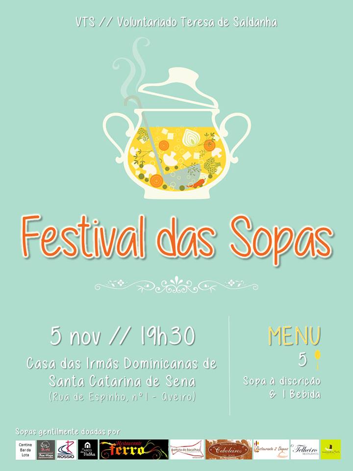 O Voluntariado Teresa Saldanha (VTS) promove um festival das sopas no próximo sábado, dia 5, a partir das 19h30, na Casa das Dominicanas de Santa Catarina de Sena, no Bairro de Santiago. Tem um custo de 5 euros, que inclui a sopa e a bebida. Haverá 13 sopas disponíveis e, se for adquirido antecipadamente, haverá descontos no bilhete.